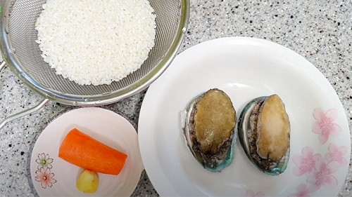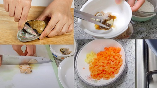 Cà rốt và gừng băm nhuyễn, bào ngư thì rửa sạch với muối, có thể dùng bàn chải đánh răng làm sạch chất dơ bám trên bào ngư. Sau khi rửa sạch, tách lấy thịt bào ngư ra khỏi vỏ và cắt nhỏ bào ngư, phần bao tử bào ngư cắt nhỏ để vào chén riêng để rang chung với gạo.