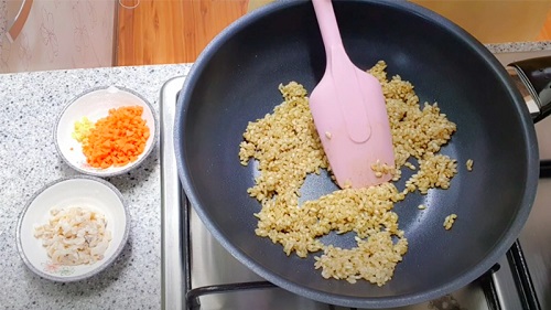 Dùng một cái chảo nhỏ cho ít dầu ăn vào và mở lửa cho dầu nóng lên, sau đó cho phần ruột bào ngư đã cắt nhỏ và gạo vào đảo đều khoảng 1 phút tắt bếp.