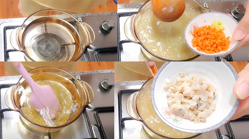 Dùng một cái nồi khác cho nước lọc vào để tiến hành nấu cháo và cho gạo vào đảo trên chảo vào cùng và mở lửa nấu đến khi nước trong nồi bắt đầu sôi lên thì cho tiếp cà rốt và gừng băm nhuyễn vào cùng.