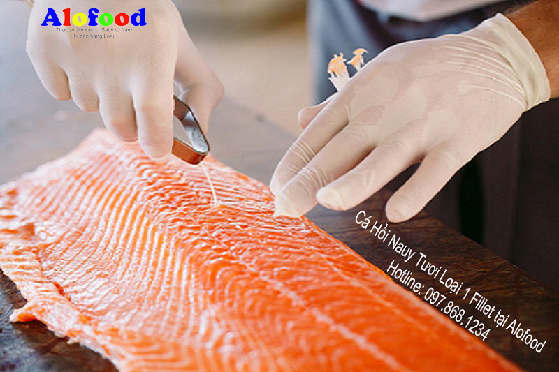 Để đảm bảo an toàn khi sử dụng, bạn cần đeo bao tay sạch và kiểm tra lại miếng cá hồi đã được nhổ sạch xương chưa. Nếu còn thì bạn dùng nhíp để nhổ. Hoặc rạch một đường dọc theo xương cá sau đó dùng tay lấy xương ra ngoài.