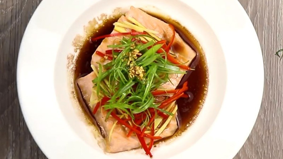 Bạn cho những miếng cá hồi lên một cái đĩa, rải gừng và ớt sừng lên trên những miếng cá. Tiếp đến là đổ nước tương lên bề mặt cá rồi lấy màng bọc thực phẩm bọc đĩa cá lại, sau đó cho vào xưởng hấp, hấp trong 15 phút là được.