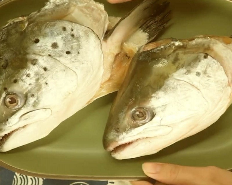 Đầu cá hồi mua về bạn rửa sạch, có thể dùng dao cắt làm đôi và bỏ mang cá.Để khử mùi tanh bạn ngâm đầu cá với nước pha với 2 muỗng canh rượu trắng khoảng 5 phút rồi rửa lại nước sạch, để ráo.