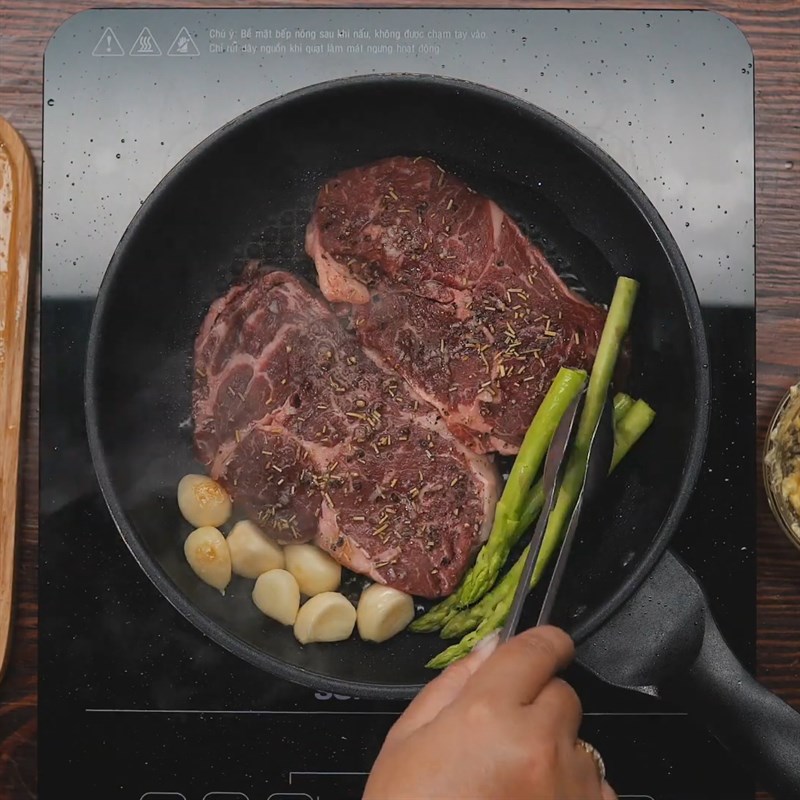 Tiếp theo, bạn cẩn thận áp chảo 2 mặt thịt bò trong 5 phút thì hạ lửa. Sau đó, bạn hãy cho 50gr bơ lạt vào chảo cho tan chảy, rồi cho tỏi và nhánh hương thảo và đảo đều và tắt bếp.