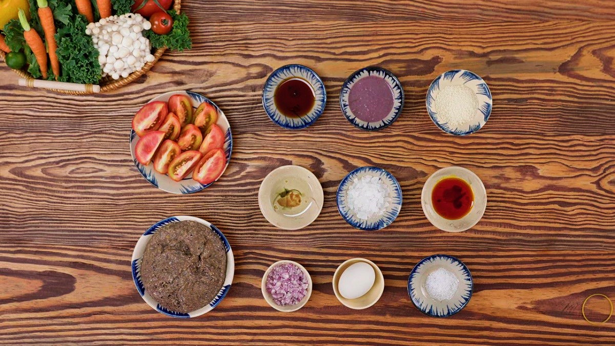 Rau ăn kèm bạn rửa sạch, nhặt bỏ phần hư, sâu rồi cắt khúc vừa ăn. Cà chua bạn rửa sạch, cắt múi cau.
