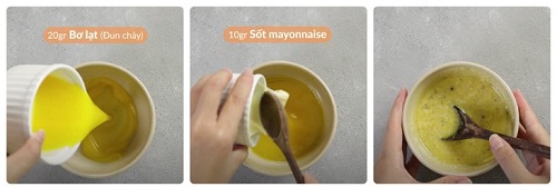Cho vào tô 20g bơ lạt đun chảy, 10g xốt mayonnaise, 1 muỗng cà phê tiêu xay, 1/2 muỗng cà phê muối rồi trộn đều.