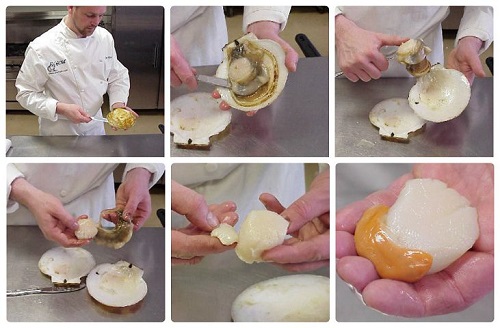 Đưa mũi dao nhọn vào một bên của sò điệp, cạy nhẹ. Khi vỏ sò đã được mở ra, lướt con dao nhẹ nhàng bên dưới phần thịt của sò điệp để lấy thịt ra khỏi vỏ. Lấy nhẹ nhàng phần thịt ra ngoài.