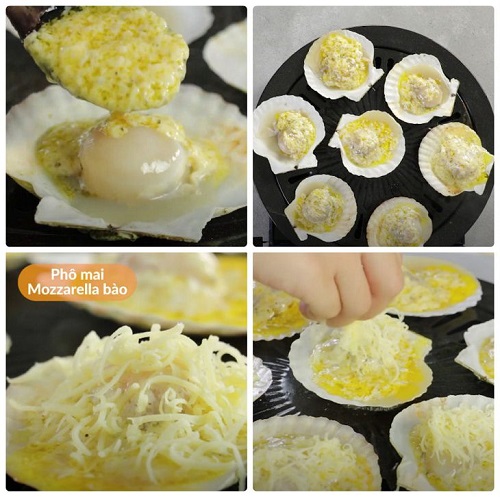 Nướng lửa vừa đến khi sò chín tái thì rắc phô mai Mozzarella bào lên mặt. Nướng thêm 5 - 10 phút đến khi lớp phô mai chảy ra, là được.