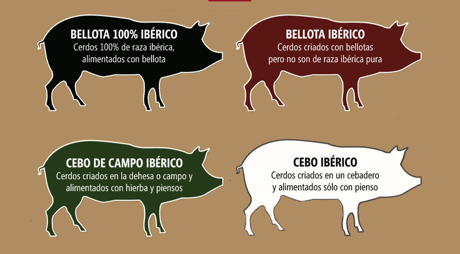 Dựa vào chế độ dinh dưỡng của heo, người ta cũng có thể phân đùi heo muối Iberico thành 3 loại: