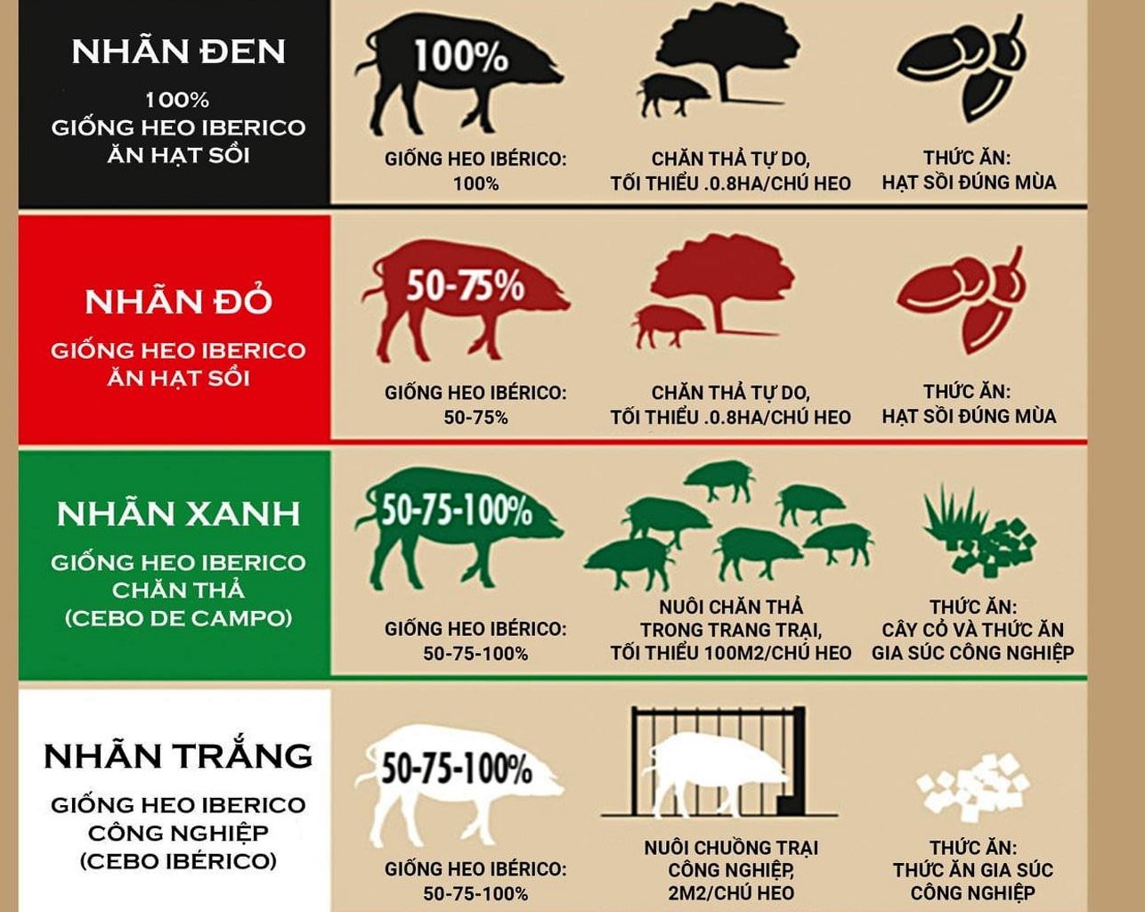 ● Nhãn màu đỏ (Red Label) và đen (Black Label) dành cho đùi heo muối Iberico ham de bellota và Bellota ham 100% Iberico, tức là nhãn dành cho loại đùi heo có chất lượng cao nhất.