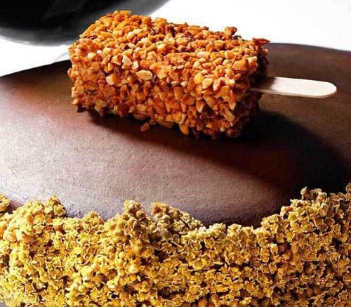- Cắt miếng gan ngỗng thành hai khối hình dài khoảng 8 cm, rộng 4 và 1,5. Che phủ 6 bề mặt gan bằng hỗn hợp hạnh nhân sau khi đã cho balsamico xung quanh gan ngỗng, sử dụng que quế, để tạo thành cây kem gan ngỗng hoàn hảo.