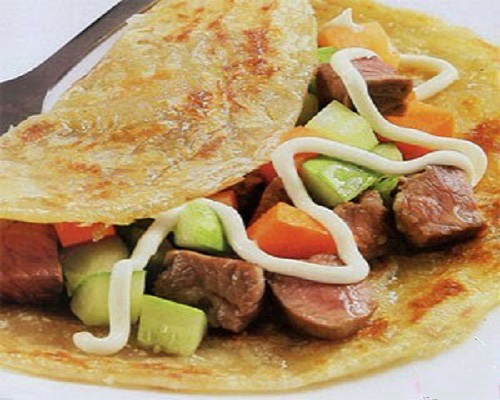 - Sử dụng một chảo khác để rán bánh bột , cho vào nửa muỗng súp dầu ăn và rán bánh đến khi vàng đều cả hai mặt. Sau đó cho phần thịt cừu và rau củ vào giữa làm nhân bánh, cuộn bánh lại và rưới 1 ít sốt mayonnaise lên. Dùng trong khi nóng và ăn kèm với nước tương cà.