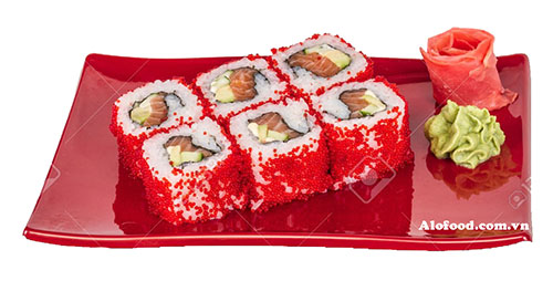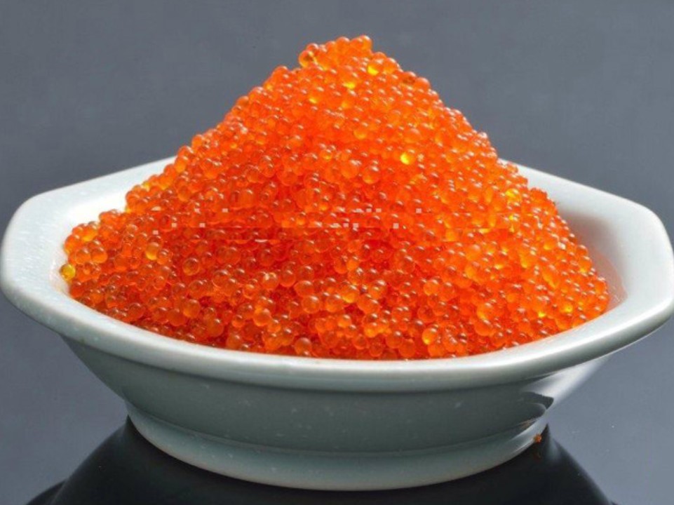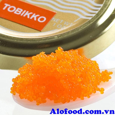 Trứng Cua Tobiko. Loại trứng cá nhỏ này có màu có màu cam hay đỏ và là trứng của cá chuồn (Flying Fish). Chúng cũng giòn như những loại trứng cá khác. Tobiko được dùng trong các món ăn Nhật và Hawaii.